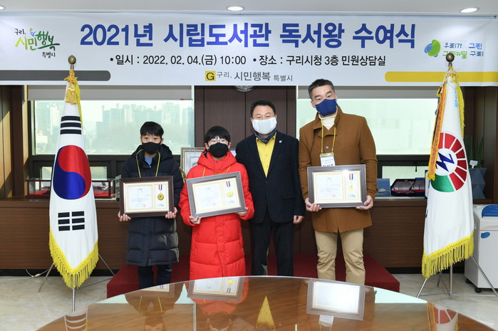경기 구리시 시립도서관은 최근 2021년 '시립도서관 독서왕' 수여식을 개최해 최지호(초등부)·손찬헌(중등부)군과 정성욱씨(성인부)에게 상장을 수여하고 1년간 20권까지 대출 권수 확대 혜택을 부여했다. 사진은 수여식에서 안승남 시장(오른쪽 두 번째)과 수상자들이 기념촬영을 하는 모습. (사진제공=구리시청)