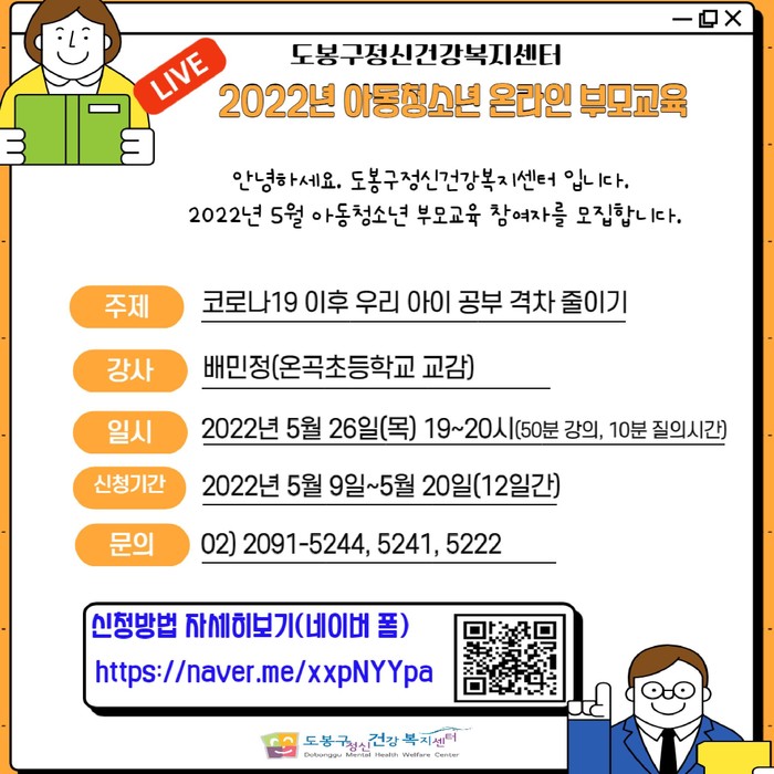 이동진 구청장은 “장기간의 코로나19로 인해 아동청소년의 정신건강의 중요성이 대두되고 있다. 포스트 코로나 시대 우리 지역 아동청소년의 정신건강을 위해 다양한 부모교육의 기회를 제공하도록 하겠다”라고 말했다.