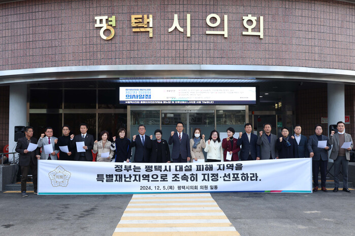 [평택=오왕석 기자] 평택시의회(의장 강정구)는 5일, 평택시의회 앞에서 최근 폭설로 인한 대규모 피해에 대해 ‘평택시 대설 피해 특별재난지역 선포 촉구 성명서’를 발표했다.