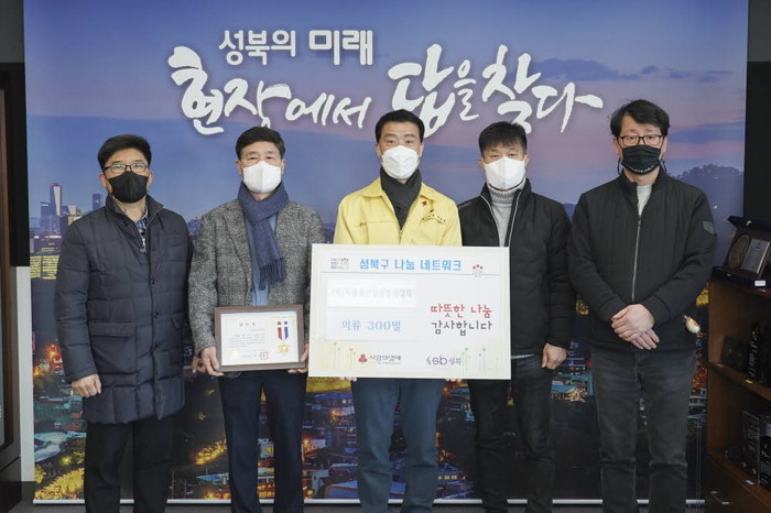 성북구는 23일 패션봉제업체로부터 ‘따뜻한 겨울나기 캠페인’에 동참하며 소외계층을 위해 제작한 의류 300벌(약 240만원 상당)을 전달받았다. 이번에 기부한 의류는 지역내 복지시설에 지원될 예정이다. 사진은 이승로 구청장(가운데)과 관계자들이 기념촬영을 하는 모습. (사진제공=성북구청)