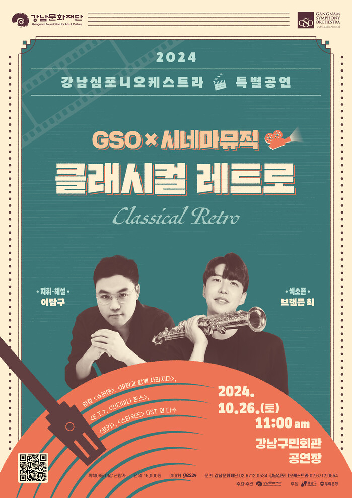 [시민일보 = 이대우 기자] (재)강남문화재단(이사장 이자연) 산하 강남심포니오케스트라(이하 강남심포니)가 오는 10월 26일(토) 오전 11시 강남구민회관 공연장에서 클래식 음악과 영화음악이 만나는 공연을 개최한다. 이 공연은 깊어가는 가을을 맞아 7080세대가 함께 울고 웃었던 추억의 영화음악 OST를 오케스트라 연주로 감상할 수 있는 기회를 제공함으로써 중장년 관객들에게는 젊은 날의 추억을, 가족관객 및 젊은 관객들에게는 클래식으로 접하는 레트로 감성의 새로움을 선사하기 위해 마련되었다.