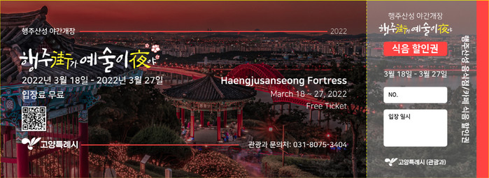 고양시가 행주산성 야간개장 ‘행주가(街) 예술이야(夜)’를 3월 18일부터 27일까지 열흘 간 개최한다.