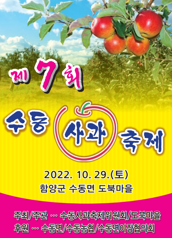 함양군에 따르면 수동사과축제위원회는 오는 29일 1일간 수동면 도북마을 200ha규모의 사과단지 일원에서 사과판매, 사과따기체험, 수동사과열차 체험 등 20여개의 풍성한 프로그램으로 축제를 개최한다고 한다.