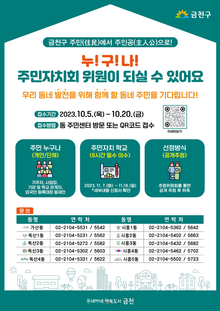 [시민일보 = 여영준 기자] 금천구(구청장 유성훈)는 지역사회 발전과 마을 민주주의 실현에 함께할 ‘제4기 금천형 주민자치회 위원’을 5~20일 모집한다고 밝혔다.
