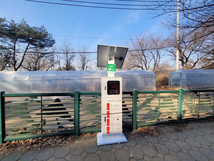 | ▲ 안산 황톳길 입구에 설치된 자동심장충격기. (사진=서대문구청 제공) |