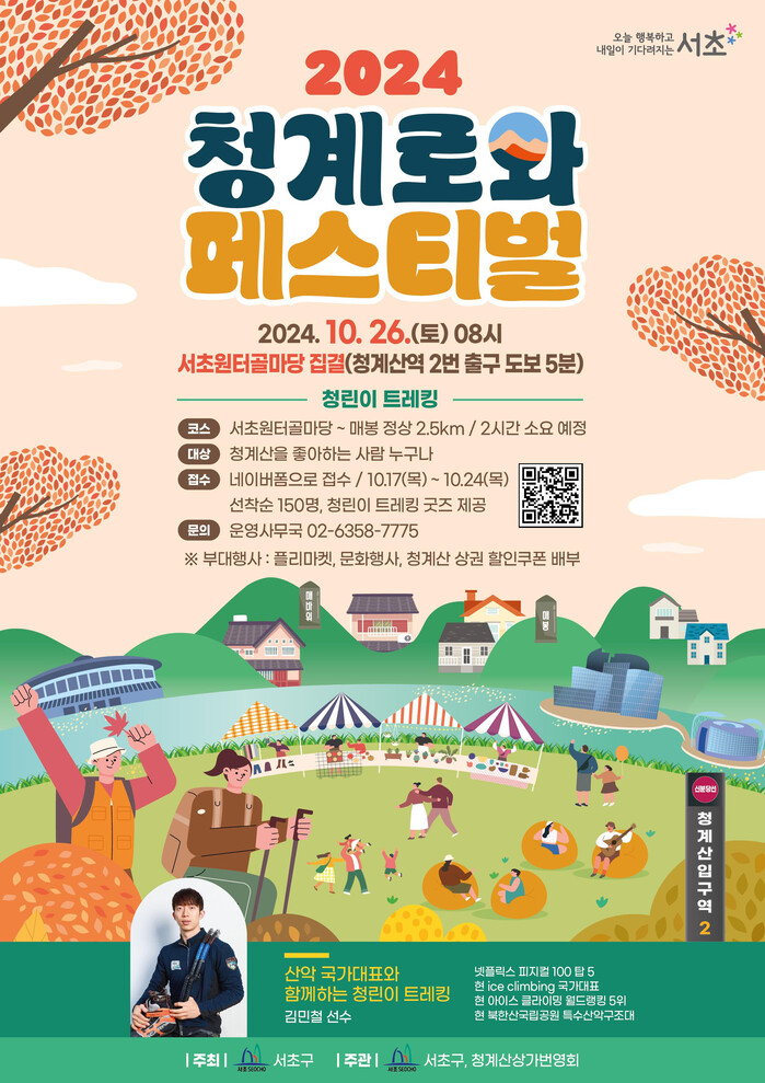 구와 청계산상가번영회가 함께 추진하는 이번 행사는 청계산역 2번 출구부터 서초원터골마당, 청계산 등산로 등 곳곳에서 다채롭게 이어진다.