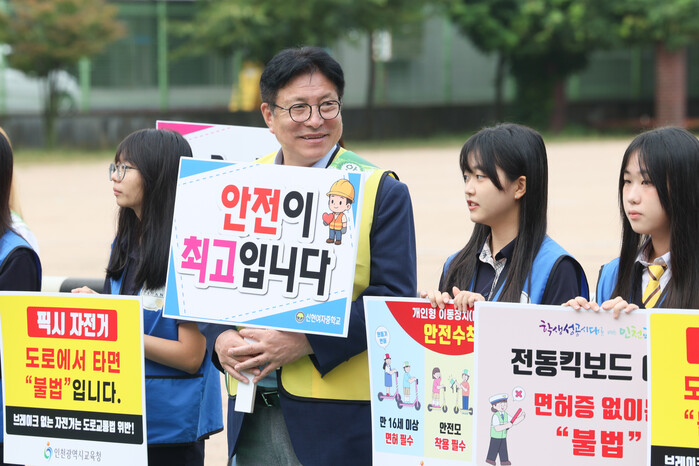 [인천=문찬식 기자] 인천광역시교육청(교육감 도성훈) 25일 신현여자중학교 앞 통학로에서 보행 공간 공사 완료에 따른 등굣길 안전 점검 행사를 진행했다.