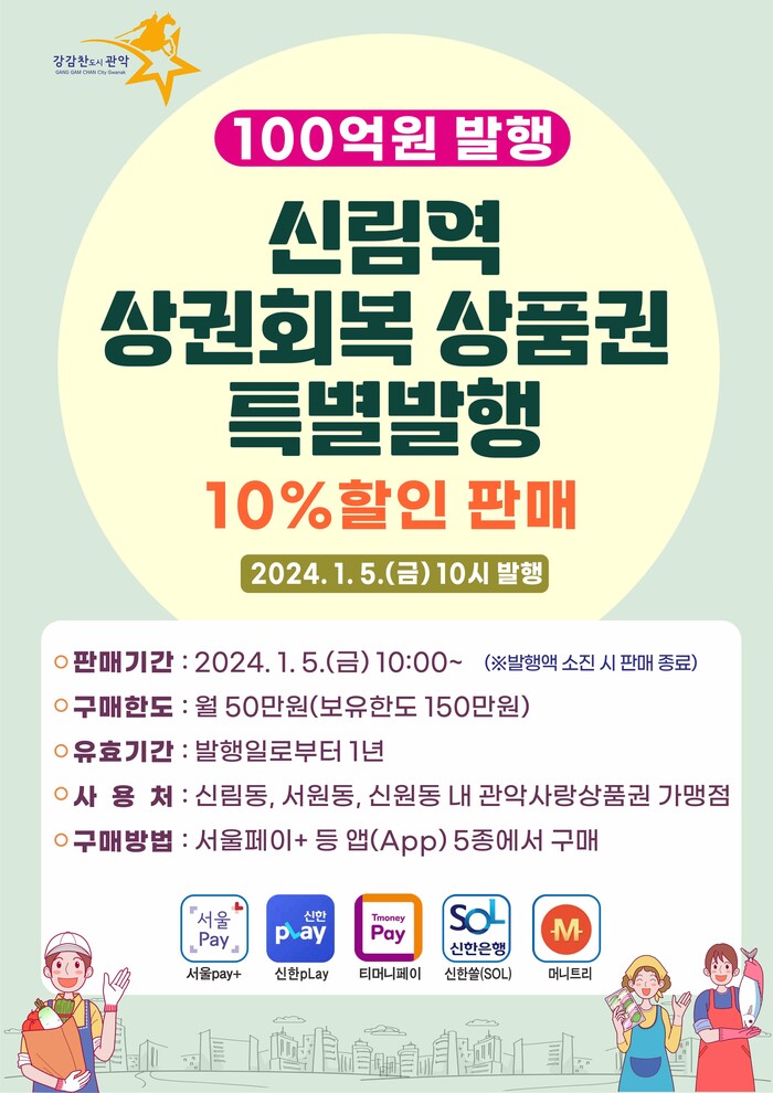 [시민일보 = 여영준 기자] 관악구(구청장 박준희)는 방문고객 감소와 매출 하락으로 어려움을 호소하는 신림역 인근 상권회복을 위해 ‘신림역 상권회복 상품권’ 100억원을 추가로 특별 발행한다고 27일 밝혔다.