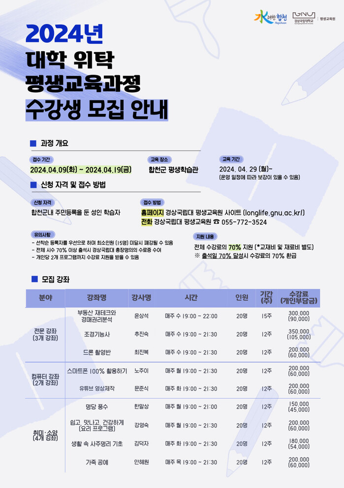 신청 방법은 경상국립대학교 평생교육원 홈페이지를 통해 온라인으로 신청하면 되며, 모든 프로그램의 수강료는 출석률 70% 달성 시 전체 수강료의 70%를 군에서 지원하며, 교재비·재료비는 개인이 부담해야 한다.