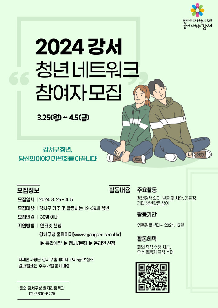 [시민일보 = 이대우 기자] 서울 강서구(구청장 진교훈)는 청년의 시각에서 다양한 정책을 발굴하고 제안하기 위한 ‘2024 강서 청년 네트워크’ 참여자를 모집한다고 밝혔다.