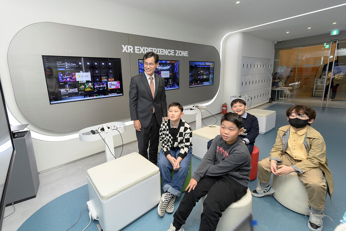 | ▲ 목동미래교육센터 XR(확장현실) 체험존에서 학생들과 이기재 구청장의 모습. (사진=양천구청 제공) |