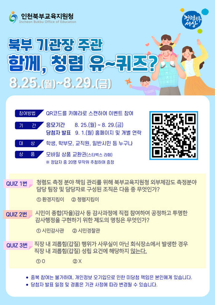 [인천=문찬식 기자] 인천북부교육지원청(교육장 윤건선)은 공직사회 청렴에 대한 일반시민들의 관심을 높이고 참여형 소통 문화를 조성하기 위해 8월 25일부터 29일까지 청렴 퀴즈 이벤트를 실시한다.