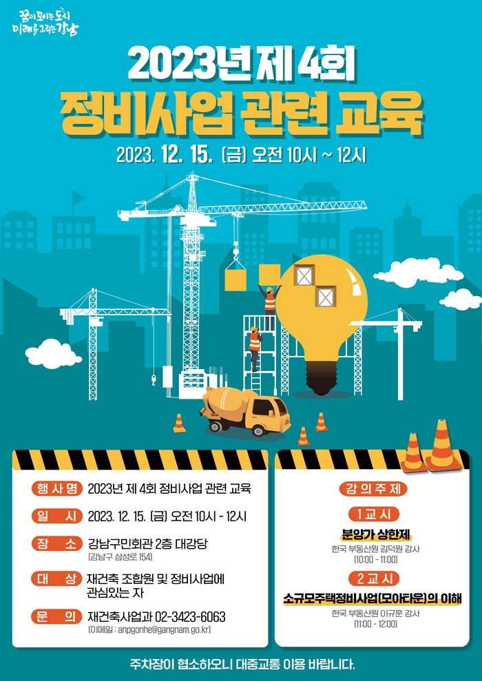 2차시에는 일원동 대청마을 모아타운 지정 이후 다른 지역에서도 관심이 높은 소규모 재건축 정비사업에 대해 자세하게 알려줄 계획이다.