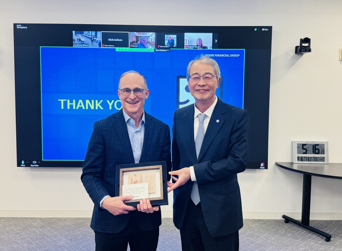 | ▲ (왼쪽부터) GII 스티븐 프레스턴 대표이사와 우리금융그룹 임종룡 회장이 지난 16일 미국 메릴랜드주 록빌에 위치한 굿윌스토어 본사에서 기념사진을 촬영했다. 이날 임 회장은 대한천일은행 설립인가서 액자를 프레스턴 대표이사에게 선물했다. (사진=우리금융 제공) |