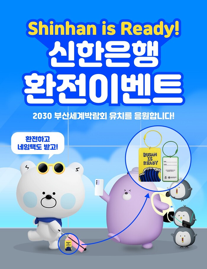 인천국제공항, 김포국제공항 환전소에서 원화 50만원 이상 환전하는 고객을 대상으로 진행되는 이번 이벤트는 2030 부산세계박람회 유치 응원 메시지‘BUSAN IS READY’가 새겨진 여행 가방 네임택을 제공하는 것으로, 신한은행 인천국제공항 환전소에서는 선착순 고객 4천명, 김포국제공항에서는 선착순 고객 1천명에게 네임택을 제공한다.