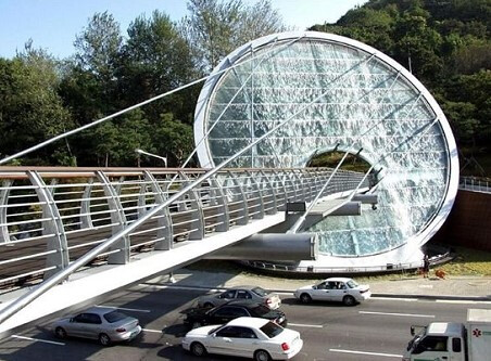 또한 앵커 케이블 트레이 시스템(Anchor Cable Tray System)으로 설계돼 원반은 앵커를 통해 직접 산에 연결되고 원반에 연결된 케이블은 육교 전체의 하중을 잡아당겨 하중이 케이블과 앵커를 통해 산에 전달되도록 설치됐다. 비스듬한 원반 구조의 워터스크린과 육교 계단 등이 산 지형에 따라 자연스럽고 균형감 있게 배치된 것이 특징이다. 워터스크린의 원형 유리판 주위로 분수용 노즐 287개와 조명시설이 설치돼 있어, 주변을 오가는 주민들이 언제나 깨끗한 물줄기와 흐르는 폭포를 감상할 수 있다.