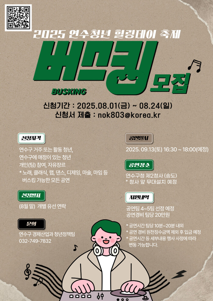 [인천=문찬식 기자] 인천 연수구(구청장 이재호)는 오는 9월 13일에 개최되는 ‘2025 연수청년 힐링데이’ 축제 무대에 오를 버스킹 공연팀을 모집하고 있다.