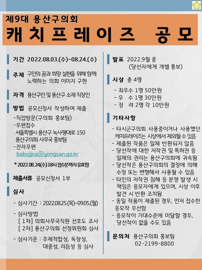 | ▲ 제9대 용산구의회 캐치프레이즈 공모 안내문. (사진제공=용산구의회) |