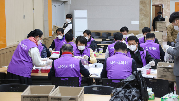| ▲ 충남 서산시의회 이연희 의장을 비롯한 소속 의원 9명과 의회사무국 직원 등으로 구성된 봉사단이 지역내 각급 학교에 배부할 코로나19 신속항원검사키트 소분 포장 작업을 하고 있다. (사진제공=서산시의회) |