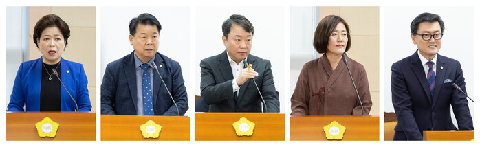 | ▲ (왼쪽부터) 노경숙·변정열·김용권·최태영·김철수 의원이 해당 상임위원회에서 제안설명을 하고 있다. (사진=구로구의회 제공) |