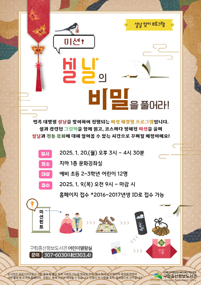 [시민일보 = 이대우 기자] 구립증산정보도서관(관장 김숙경)은 다가오는 설날을 맞이하여 설날 그림책을 함께 읽고 미션을 통해 우리나라 전통 세시 풍속을 배워볼 수 있는 ‘설날 맞이 프로그램 <미션! 설날의 비밀을 풀어라!>’를 1월 20일(월) 오후 3시에 도서관 지하 1층 문화강좌실에서 운영한다.