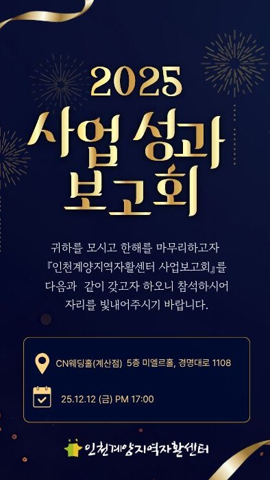 [인천=문찬식 기자] 인천계양지역자활센터(센터장 한경주)는 2025년 한 해 동안 추진한 자활사업의 성과를 공유하고 참여주민을 격려하기 위해 ‘2025년 사업성과 보고회’를 오는 12월 12일(금) 오후 5시 CN웨딩홀 계산점에서 개최한다고 밝혔다.