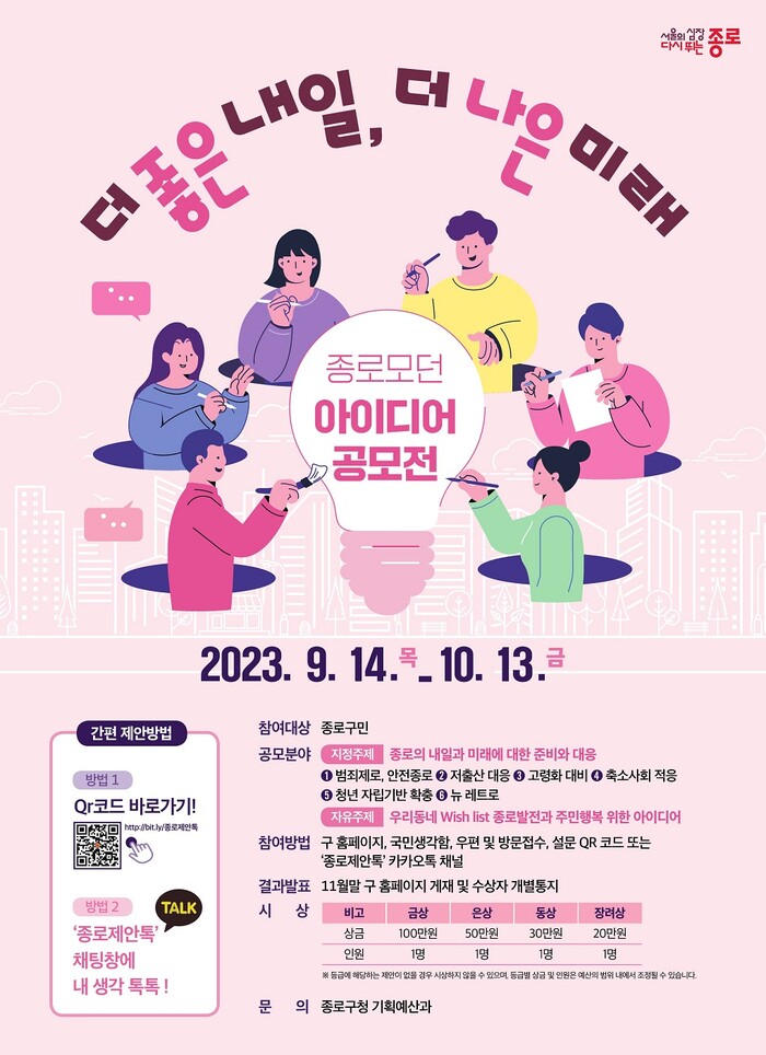 정문헌 구청장은 “주민들의 소중한 생각이 녹아든 맞춤형 정책을 시행하고자 이번 공모전을 열게 됐다”며 “종로를 아끼고 사랑하는 주민분들의 다양한 아이디어를 자양분 삼아 더 나은 종로의 내일을 열고자 한다. 관심 있는 분들의 많은 참여를 바란다”고 밝혔다.