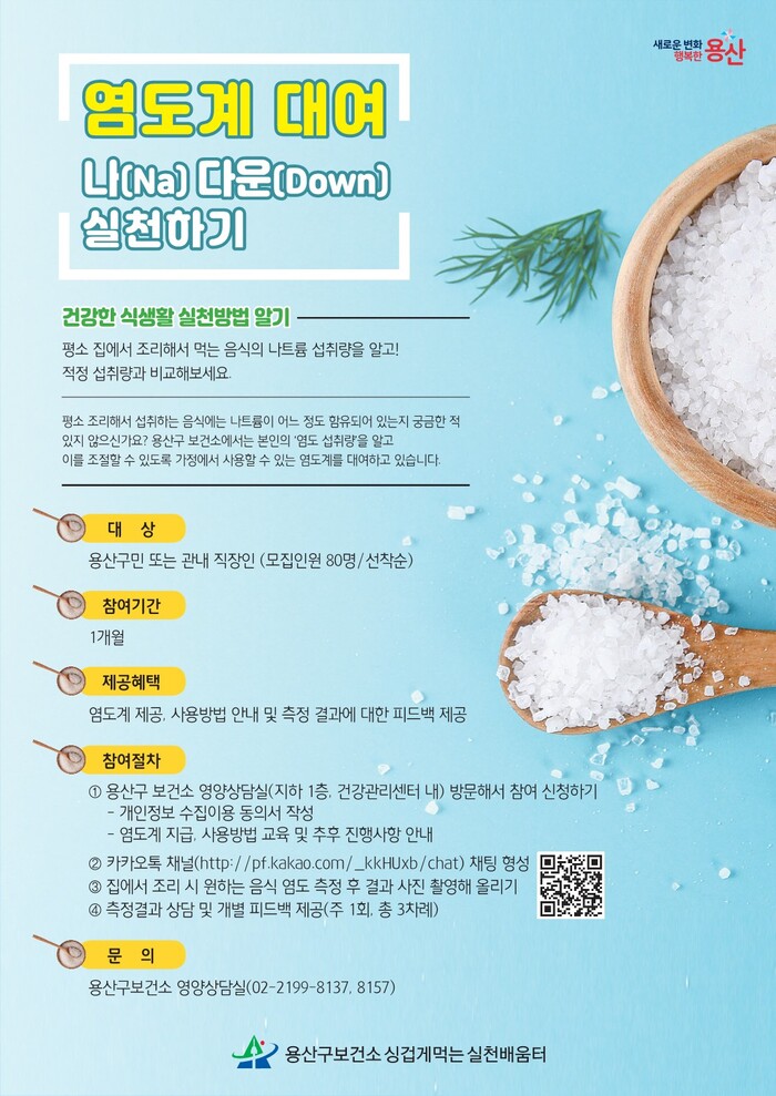 [시민일보 = 홍덕표 기자] 용산구가 저염 식생활 실천 향상을 위해 구 건강관리센터 내 영양상담실에서 가정에 염도계를 무료 대여한다.