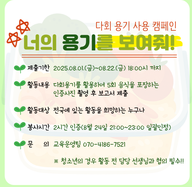 [인천=문찬식 기자] 2050 탄소중립 실현을 위한 생활 속 친환경 실천의 일환으로, 다회용기 사용을 장려하는 비대면 자원봉사활동 ‘너의 용기를 보여줘’ 캠페인이 8월 1일부터 시작됐다.