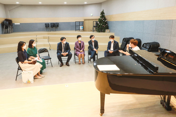 | ▲ 소년소녀합창단 연습실을 방문한 화성시의원들이 관계자와 이야기를 나누고 있다. (사진제공=화성시의회) |