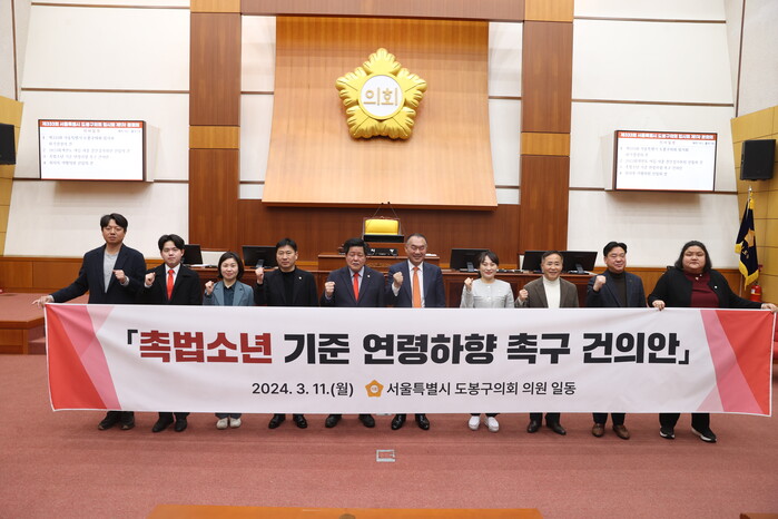 | ▲ 제333회 임시회에서 안병건 의원 외 13인이 발의한 '촉법소년 기준 연령하향 촉구 건의안'이 채택됐다. 사진은 촉법소년 기준 연령 하향을 촉구하고 있는 의원들의 모습. (사진=도봉구의회 제공) |