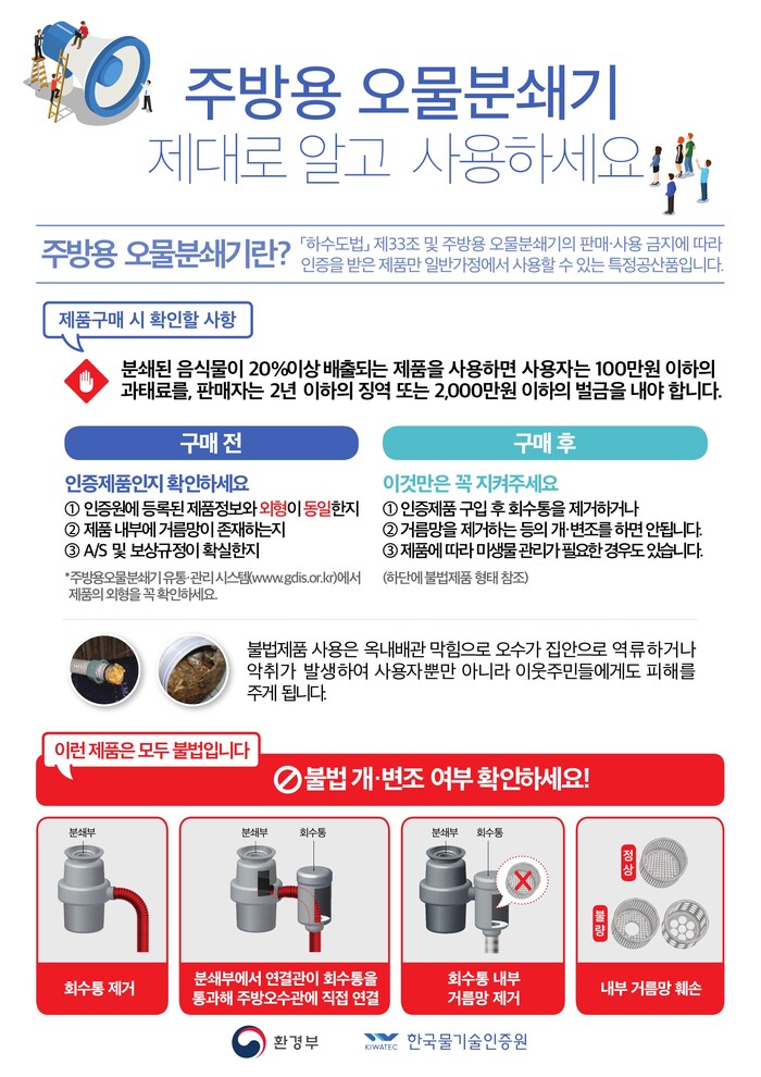 한편 주방용 오물분쇄기의 올바른 사용 방법은 음식물 찌꺼기 80% 이상은 회수통으로 받아 음식물 종량제 봉투로 배출하고 20% 미만의 음식물 찌꺼기만 하수로 배출하는 것이다. 또한 주방용 오물분쇄기는 「하수도법」제33조에 따라 환경부 장관의 승인을 받은 제품만 사용할 수 있다.