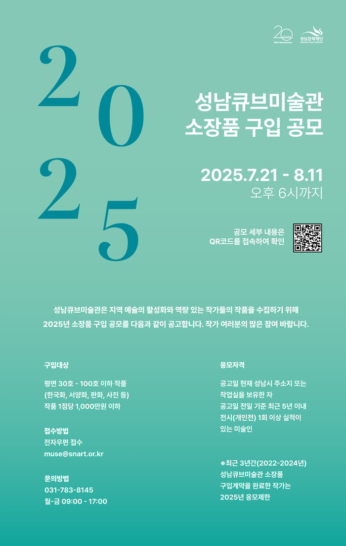[성남=오왕석 기자] 성남문화재단(대표이사 윤정국)은 공공미술관으로서 성남큐브미술관의 정체성을 강화하고 예술적 가치가 높은 우수 소장품을 확보하기 위해 ‘2025 성남큐브미술관 소장품 구입 공모’를 오는 8월 11일(월)까지 진행한다.