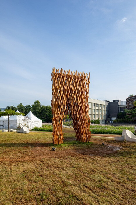 그중에서도 세계적인 건축가 켄고 쿠마(Kengo Kuma)의 작품 〈키구미(Kigumi)〉가 단연 눈길을 끈다. 전통 목구조의 섬세한 미학과 현대적 감각이 만나는 지점에서 탄생한 이 작품은 일본 전통 목구조 기법인 ‘지고쿠구미(地獄組)’를 현대적으로 재해석했다. 재료의 본질적인 힘과 구조미를 동시에 드러낸다. 그렇게 완성된 〈키구미〉 속으로 빛과 그림자가 스며들며 시시각각 다른 풍경을 만들어내고, 관람자는 마치 숲속에 잠시 머무는 듯한 따뜻하고 부드러운 공간을 경험하게 된다.