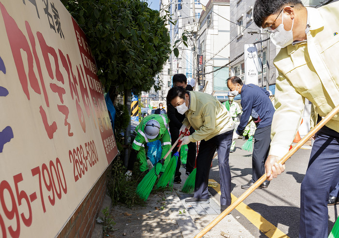 김태우 서울 강서구청장이 11일 담배꽁초 무단투기와 쓰레기 문제에 대해 구청장이 현장을 직접 찾아 해결책을 찾고 지역주민의 애로사항을 듣기 위해 '1일 환경공무관'으로 변신해 화곡동 강서구청 먹자골목 청소에 나섰다. 사진은 이날 김 구청장(가운데)이 환경공무관과 함께 강서구청 먹자골목을 청소하고 있는 모습. (사진제공=강서구청)