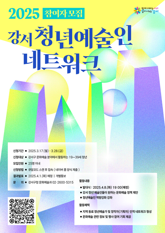 [시민일보 = 박소진 기자] 강서구(구청장 진교훈)가 ‘2025 강서 청년예술인 네트워크’ 구성을 위한 참여자를 모집한다고 14일 밝혔다.