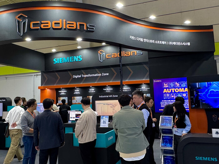 ㈜캐디언스시스템은 지멘스 디지털 인더스트리 소프트웨어사(Siemens Digital Industries Software)와 함께 Digital Transformation 존, Immersive Engineering 존, Industrial AR 존으로 부스를 구성하여 설계부터 제조까지 다양한 프로세스를 직접 체험할 수 있는 기회를 제공했다.