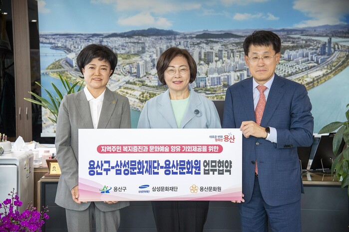 [시민일보 = 변은선 기자] 용산구(구청장 박희영)가 최근 삼성문화재단, 용산문화원과 함께 지역주민 문화복지 증진과 문화예술 향유 기회 확대를 위한 업무협약을 새로 체결했다.