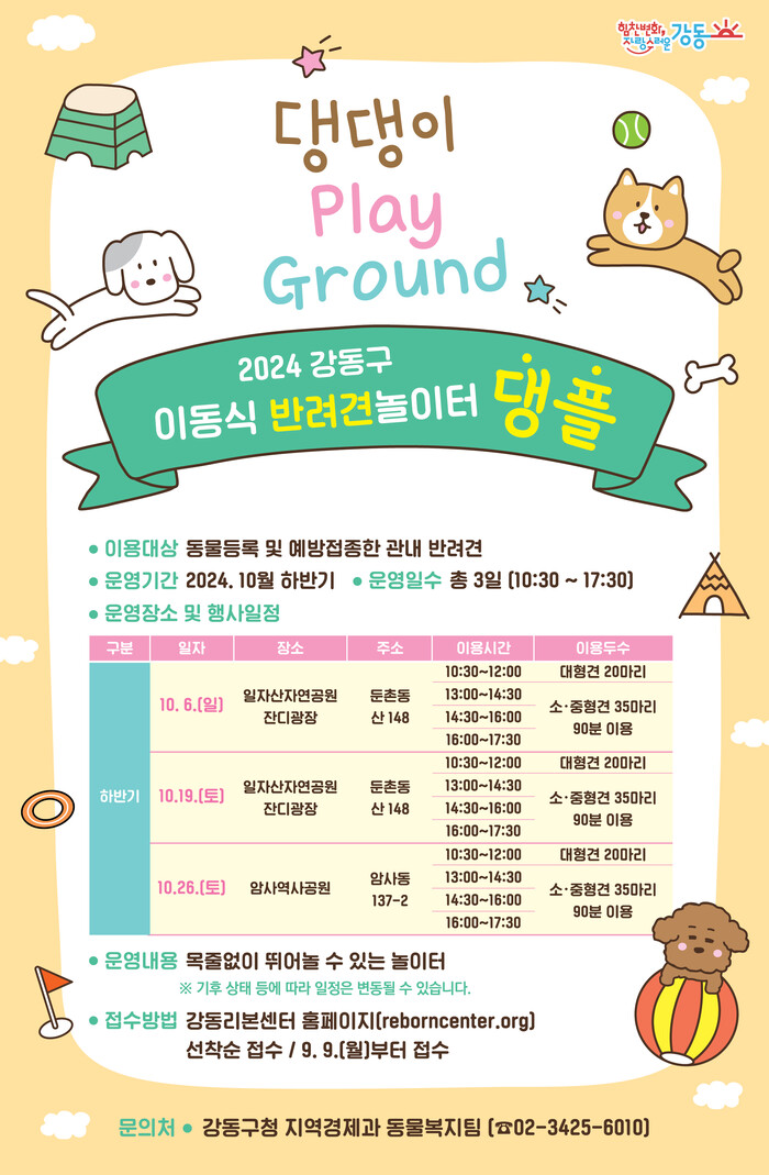 [시민일보 = 이대우 기자] 강동구(이수희 구청장)가 오는 19일(일자산 잔디광장)과 26일(암사역사공원) 이동식 반려견 놀이터인 ‘댕댕이 플레이그라운드’(이하 댕플)를 운영한다고 11일 밝혔다.