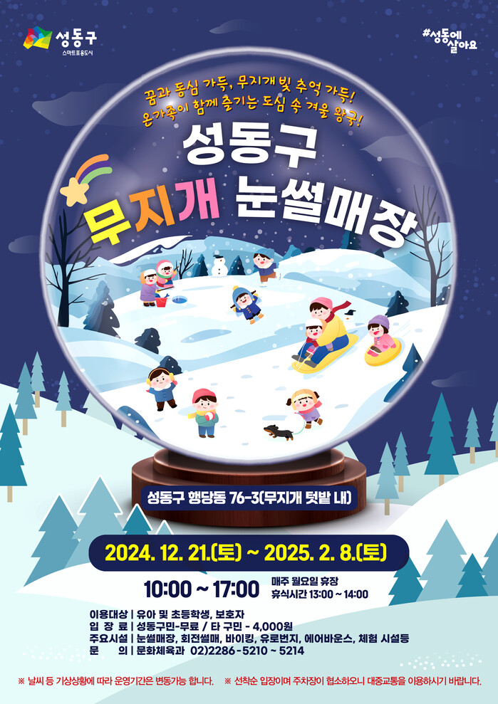 [시민일보 = 박소진 기자] 성동구(구청장 정원오)가 오는 21일 온 가족이 즐길 수 있는 도심 속 겨울 놀이터 ‘성동 무지개 눈썰매장’을 개장한다고 밝혔다.
