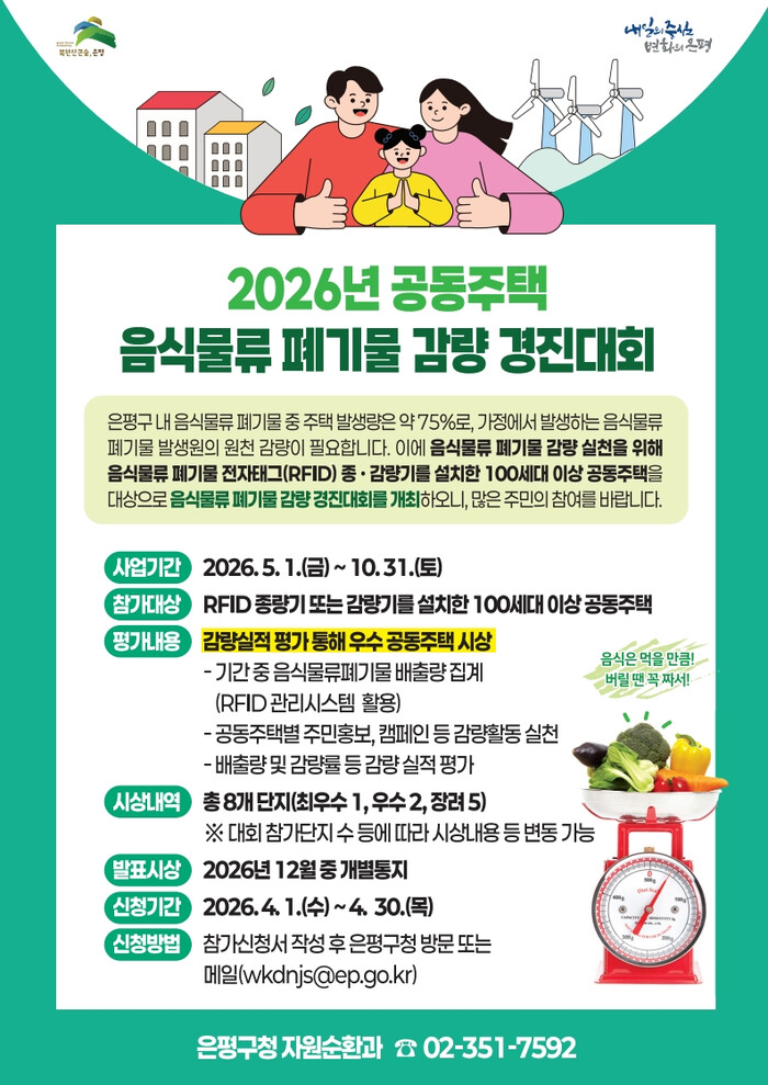 [시민일보 = 이대우 기자] 은평구(구청장 김미경)가 ‘음식물류 폐기물 감량 경진대회’ 참여 단지 모집에 나섰다.