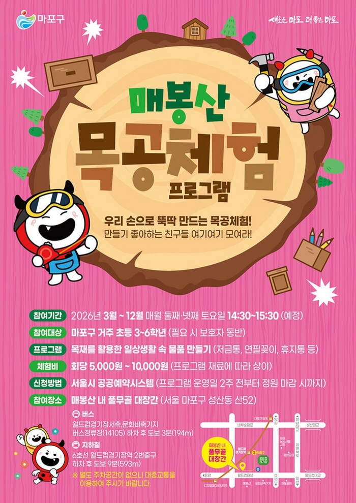 박강수 구청장은 “이번 매봉산 목공 체험 프로그램은 어린이들이 자연 속에서 직접 만들고 배우는 소중한 경험이 될 것”이라며, “관심 있는 어린이와 가족분들의 많은 참여 바란다”고 말했다.