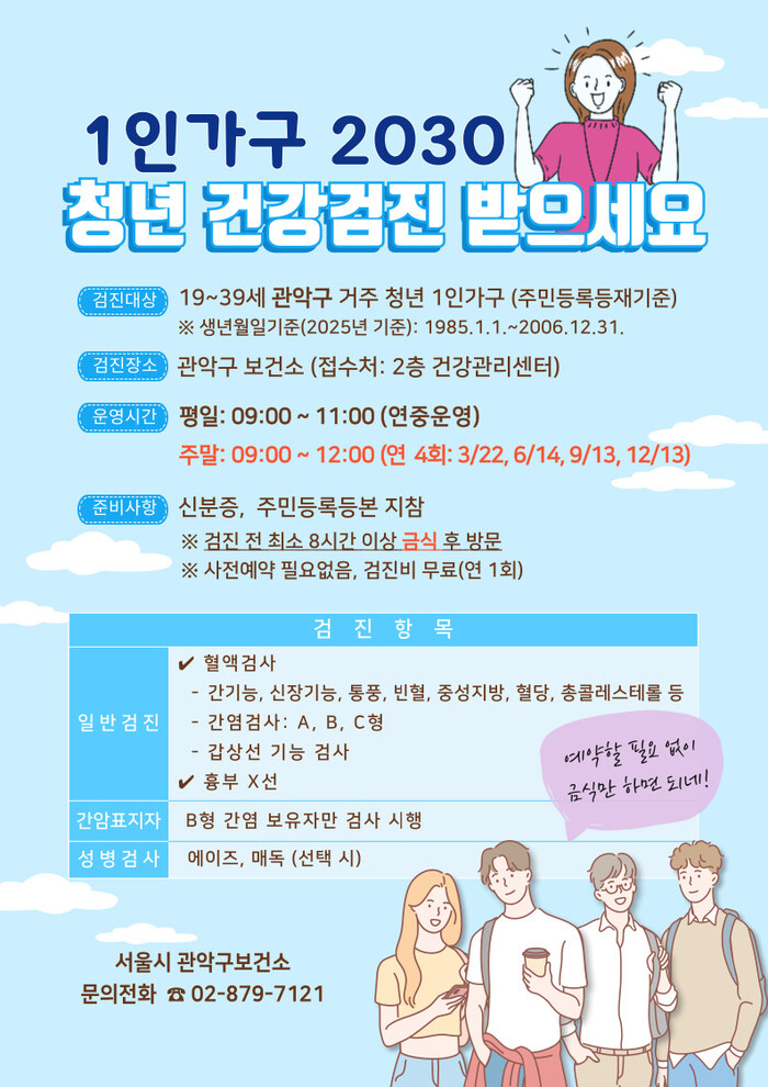 [시민일보 = 문민호 기자] 관악구(구청장 박준희)가 올해 청년 무료 건강검진을 확대시행한다.