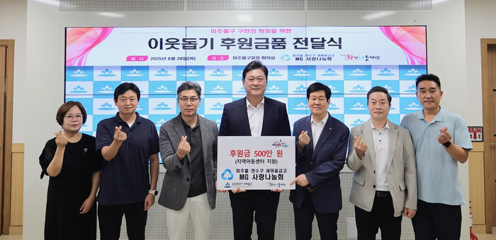 [인천=문찬식 기자] 인천 미추홀구(구청장 이영훈)는 지난 28일 구청장실에서 미추홀·연수구 18개 새마을금고 봉사단체인 엠지(MG) 사랑나눔회(회장 이기욱)로부터 관내 지역아동센터 지원을 위한 후원금 500만 원을 전달받았다.
