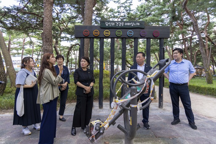 김명희 의장과 의원단은 솔밭공원 전체를 순회하며 공원 관리 상태를 점검하고, 이용자들의 불편 사항을 청취했다.