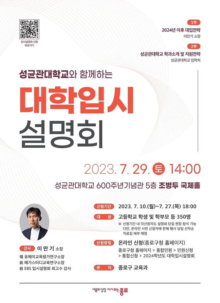 [시민일보 = 이대우 기자] 종로구(구청장 정문헌)가 수험생의 성공적인 대입 합격을 위해 오는 29일 오후 2시 성균관대학교 600주년기념관 5층 조병두 국제홀에서 ‘2024학년도 대학입시 설명회’를 개최한다.