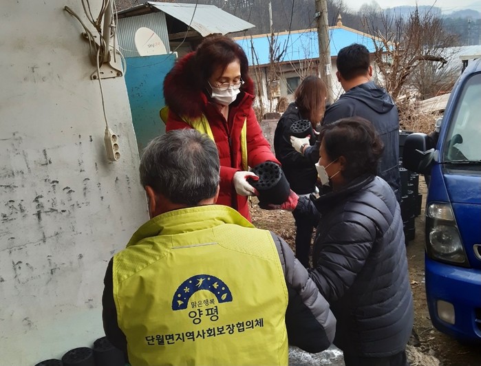 경기 양평군 단월면지역사회보장협의체는 29일 저소득 노인가구의 따뜻한 겨울나기를 위해 양평군 희망나누미에서 기부한 연탄 500장 나눔봉사를 실시했다. 사진은 이날 봉사자들이 대상가구에 연탄을 배달하고 있는 모습. (사진제공=양평군청)