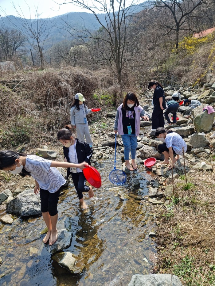 충남 아산시청소년재단, 아산시청소년교육문화센터는 지난 9일 도고산에서 지역내 초등학생을 대상으로 지역의 생태를 알아보는 ‘상반기 산들숲 생태교육 1회기’를 진행했다. 숲속에서 숲밧줄놀이 및 그네타기를 체험하고 올챙이와 도롱뇽알을 관찰했다. 사진은 이날 참여한 도고산 하천에서 가재를 찾고 있는 모습. (사진제공=아산시청)