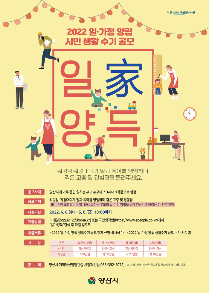 양산시는 워킹맘· 워킹 대디가 일과 육아를 병행하며 겪은 가지각색의 이야기를 통해 일·가정 양립을 위한 시민 중심의 시책을 발굴·시행하기 위하여, 4월 6일부터 5월 6일까지 2022 일·가정 양립 생활 수기 「일가 양득」 공모를 실시한다.