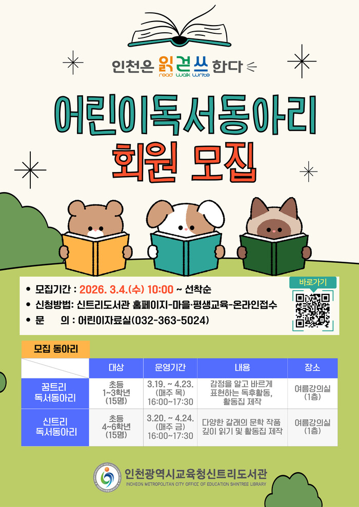 [인천=문찬식 기자] 인천광역시교육청신트리도서관(관장 정경애)은 오는 3월 4일부터 ‘어린이 독서동아리’참여자를 모집한다.